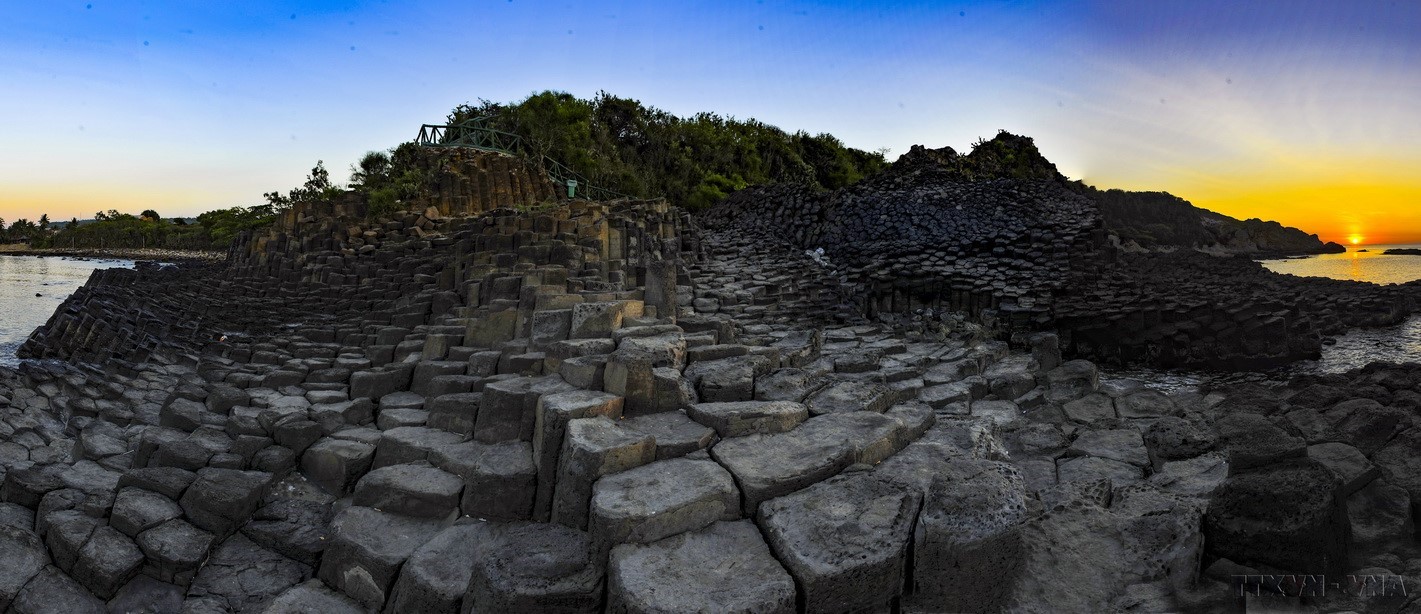 Ghềnh Đá Đĩa ở Phú Yên nổi tiếng là một tuyệt tác độc đáo của thiên nhiên với những khối đá đá hình trụ,tròn hoặc vuông xếp nối tiếp lớp này theo lớp kia. Với cấu trúc đặc sắc và diện mạo ấn tượng,ghềnh Đá Đĩa là điểm tham quan nổi tiếng của Phú Yên. Ảnh: Minh Đức-TTXVN