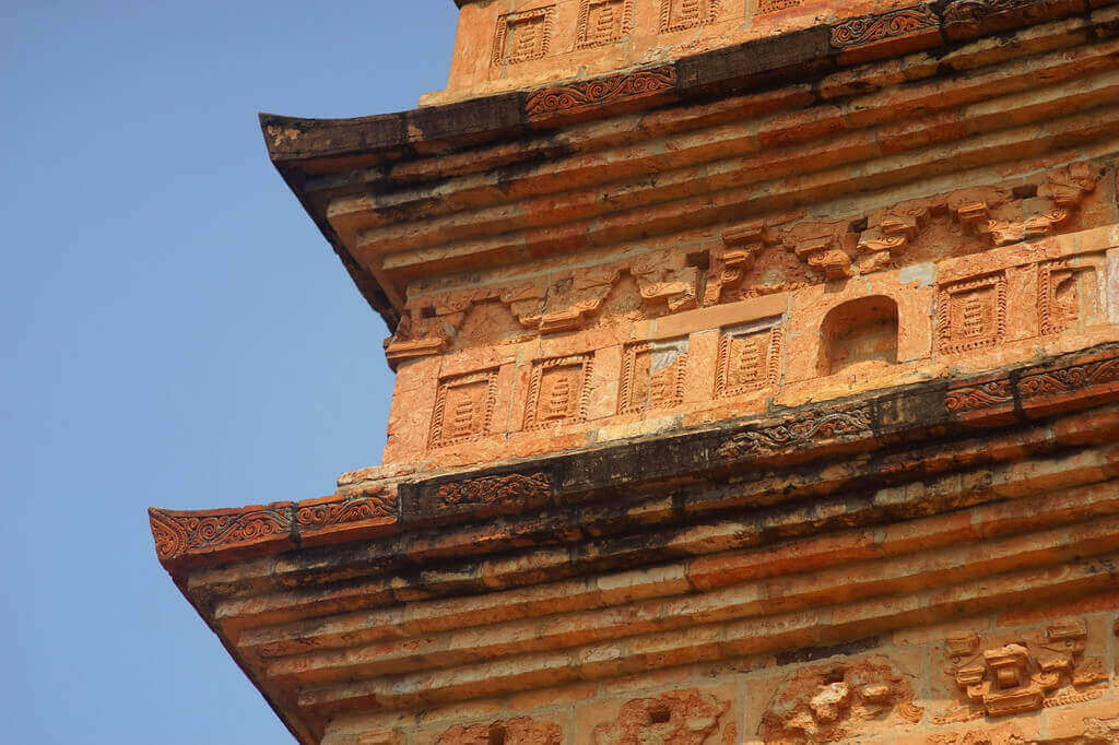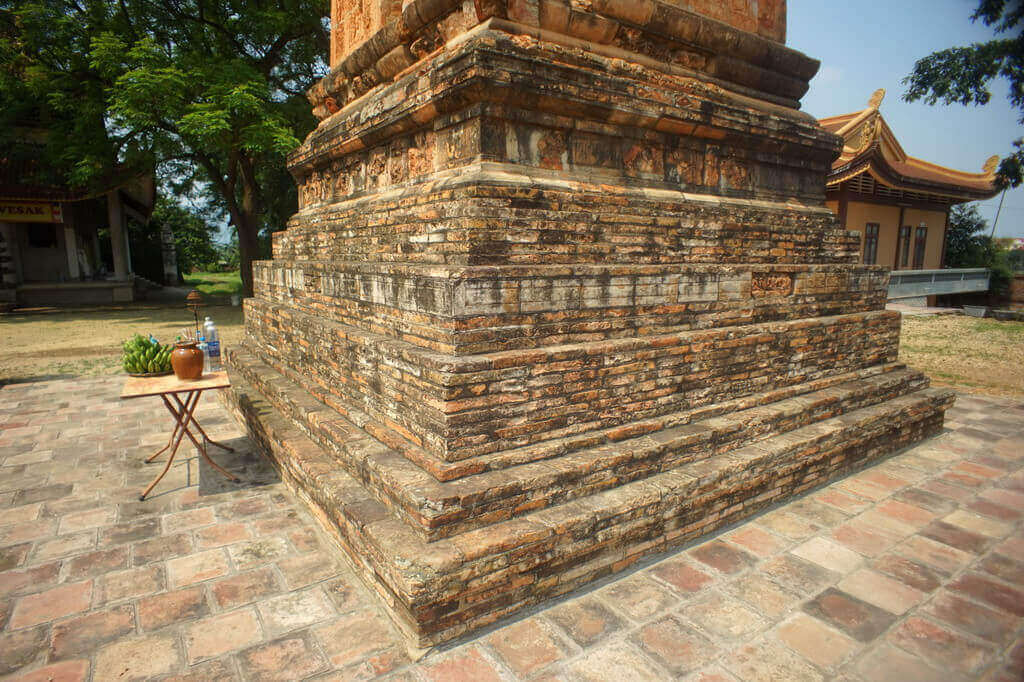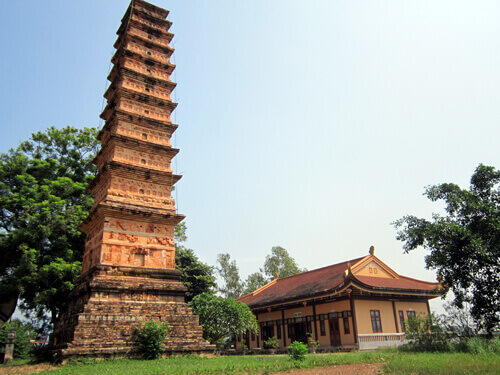 Tháp Bình Sơn (Tháp Then, Tháp chùa Then, Tháp chùa Vĩnh Khánh) thuộc thị trấn Tam Sơn, huyện Sông Lô, tỉnh Vĩnh Phúc; là một kiến trúc Phật giáo mang dấu ấn của một giai đoạn khá dài (khoảng từ thế kỷ XIV tới XVI). Tháp Bình Sơn - Chùa Vĩnh Khánh toạ lạc trên một gò đất cao và rộng rãi, diện tích khu vực khoanh vùng bảo vệ là 17.200m2, bao gồm: Tháp Bình Sơn, tòa Tam bảo cũ, Tam bảo mới, giếng mực, nhà khách, hồ sen, cổng, các công trình phụ trợ. 1. Tháp Bình Sơn Tháp hiện nay cao 16,5 mét, (chỉ còn 11 tầng và 1 tầng bệ vì phần chóp của tháp đã bị vỡ), được cấu tạo với bình đồ hình vuông nhỏ dần về ngọn, với cạnh của tầng dưới cùng là 4,45 mét, cạnh của tầng thứ 11 là 1,55 mét. Toàn bộ ngôi tháp được xây bằng gạch nung không tráng men. Từ bệ tháp đến hết tầng 2, có chiều cao dưới 6 mét hoa văn hoàn chỉnh nhất. Ở hai tầng này có họa tiết trang trí kỹ lưỡng với hàng hoa cúc, cánh sen, lá đề, hoa mặt nhẵn, rồng chạm nổi, cùng mô típ "sư tử hí cầu"… Từ tầng thứ ba trở lên, trang trí vẫn còn, nhưng càng lên cao, chiều ngang mặt tháp càng bị thu hẹp, thì trang trí cũng giảm dần. 2. Toà Tam bảo cũ: được đại trùng tu năm 1976, dạng chữ Đinh, có diện tích 131,5 m2, bao gồm Tiền đường 5 gian , Hậu cung 3 gian . Đặc biệt công trình có 2 cột đồng trụ phía trước, đua ra 6m, tạo như tay ngai. Hệ thống tượng thờ tại đây chủ yếu được làm bằng đất phủ sơn, niên đại cuối thế kỷ XIX, đầu thế kỷ XX, một vài tượng có niên đại thế kỷ XX. 3. Tam bảo mới: được xây dựng năm 2012, trên nền nhà tam bảo cũ, hình thức kiến trúc mang phong cách thiền viện. 4. Giếng Mực: tương truyền vị trí này xưa kia là đế của một ngôi tháp cổ màu xanh, khi tháp cổ này biến mất để lại một hố sâu hình giếng tròn. 5. Nhà khách: mới được xây dựng năm 2012, diện tích 283,5m2 có mặt bằng chữ nhất, kiến trúc đao mái, phù hợp với kiến trúc cổ truyền thống. 6. Hồ sen: nằm ở vườn trước tháp Bình Sơn, hiện đang trồng sen 7. Cổng vào khu di tích: gồm 4 cột trụ xây gạch, gắn 2 cánh cổng sắt ở lối chính giữa, hai lối bên rào tạm bằng cây, tre mang tính chất là cổng bảo vệ. 8. Một số trang trí của Tháp Bình Sơn Sư tử hý cầu: một trong những đồ án gây thắc mắc cho các nhà nghiên cứu là "sư tử hý cầu”, vì nó khác xa những con "sấu đớp ngọc" đội toà sen ở các bệ Phật thời Lý. Rồng: có sừng, uốn trong “ổ”, đầu quay vào giữa vòng tròn, thân không cuộn khúc mà lượn thành hình sin, do đó không "thắt túi", chân đạp ra ngoài, hoặc vắt qua thân để đạp ra ngoài, sống lưng hình “răng cưa” một chân trước đưa lên nắm "tóc"... Một số chi tiết vừa nêu phảng phất bóng dáng những con rồng cuối Trần, nhưng các chi tiết khác lại không cho phép quy con rồng trên tháp Bình Sơn vào một kiểu thức nhất định nào cả. Điều quan trọng hơn là rồng Bình Sơn thường đưa chân trước lên nắm tóc, trong một tư thế ngộ nghĩnh, rất nghịch ngợm, do đó khá "dân gian": trong trường hợp này, nó đã mang phong cách của mô - típ rồng vuốt râu thời hậu Lê. Lá đề: là một loại hình tương đối phổ biến, với những hoạ tiết hàm nhiều ý nghĩa. "Lá đề” Bình Sơn thuộc nhiều kiểu thức, nhưng kiểu nào cũng đơn giản, không thực trau chuốt như "lá đề" thời Lý. Hoa cúc dây: đã có từ thời Lý dưới dạng uốn thành khung tròn, lòng khung chứa gọn các đồ án trang trí khác. Thời Trần kế thừa bố cục ô tròn đó. Đấu ba chạc (con sơn): một điểm đáng quan tâm là đấu này đã thấy xuất hiện từ thời Lý (Tháp Chương Sơn, Nam Định) chúng càng phổ biến hơn ở dưới thời Mạc (Đình Tây Đằng, Ba Vì, Hà Nội). Tháp Bình Sơn có nhiều nét độc đáo cả về kiến trúc nghệ thuật, mỹ thuật, kỹ thuật xây dựng. Tháp Bình Sơn không những có giá trị về kiến trúc nghệ thuật, mà còn có giá trị mỹ thuật cao được gọi là “Hòn ngọc báu của kho tàng dân tộc”, trên các hòn gạch có rất nhiều loại hoa văn trang trí, chỗ hình tròn, chỗ lượn vòng tròn, chỗ sâu, nông, chỗ đậm… chứng tỏ bàn tay người thợ vô cùng điêu luyện. Tháp Bình Sơn là một công trình có kiến trúc độc đáo, theo đánh giá của người Pháp đây là một cây tháp đẹp nhất xứ Bắc Kỳ. Hiện nay, Lễ hội tại Khu di tích Tháp Bình Sơn - Chùa Vĩnh Khánh được địa phương tổ chức vào ngày 15 tháng Giêng hàng năm, gọi là “Lễ hội chùa tháp”, bao gồm những nghi thức: rước kiệu, lễ cầu nguyện cho mưa thuận gió hòa, quốc thái dân an và những chương trình văn hóa văn nghệ, thể dục thể thao, trò chơi dân gian (cờ tướng, cờ người, chọi gà...) Tháp Bình Sơn (huyện Sông Lô, tỉnh Vĩnh Phúc) được Thủ tướng Chính phủ xếp hạng là di tích quốc gia đặc biệt ngày 23/12/2015 . Nguồn: Cục di sản văn hoá
