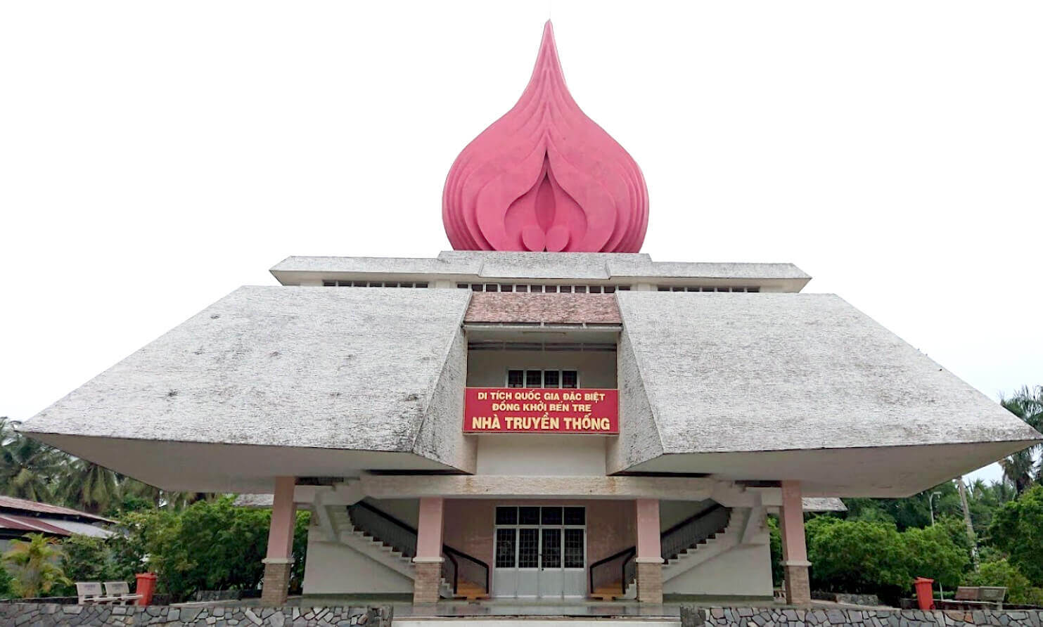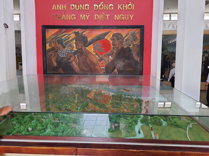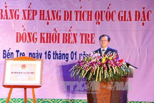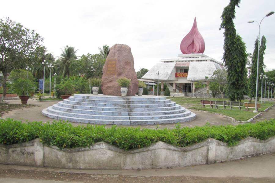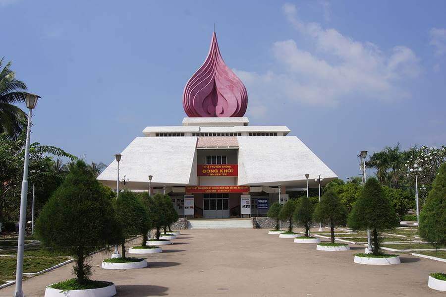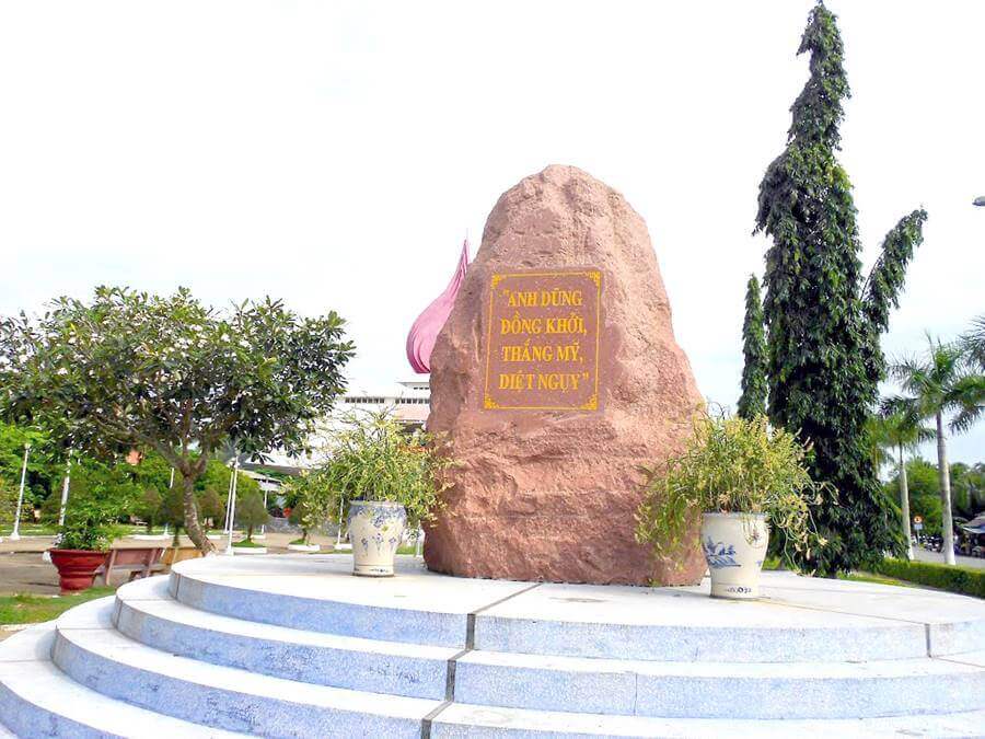 Di tích Đồng Khởi Bến Tre thuộc xã Định Thủy, huyện Mỏ Cày Nam, tỉnh Bến Tre. Nơi diễn ra sự kiện lịch sử Đồng Khởi Bến Tre, mở đầu cho phong trào Đồng Khởi của cách mạng miền Nam Việt Nam. Tháng 5/1959, Ban Chấp hành Trung ương Đảng họp Hội nghị lần thứ 15 kiểm điểm tình hình trong nước và đề ra đường lối cách mạng của cả nước và của miền Nam, xác định nhiệm vụ cơ bản: Giải phóng miền Nam khỏi ách thống trị của đế quốc, thực hiện độc lập dân tộc và người cày có ruộng, hoàn thành cách mạng dân tộc dân chủ nhân dân ở miền Nam, tiến tới xây dựng một nước Việt Nam hòa bình, thống nhất, độc lập, dân chủ và giàu mạnh. Đầu tháng 12/1959, đồng chí Nguyễn Thị Định - Phó Bí thư Tỉnh ủy Bến Tre tổ chức cuộc họp tại Cù lao Minh, Tỉnh ủy Bến Tre đã chọn 3 xã Định Thủy, Phước Hiệp và Bình Khánh thuộc huyện Mỏ Cày (nay là huyện Mỏ Cày Nam) làm căn cứ chỉ đạo và là nơi bắt đầu Đồng Khởi. Vào 11 giờ trưa ngày 12/01/1960, tại xã Định Thủy, toàn thể nhân dân nổi dậy và tiến công địch. Mở đầu phong trào đồng khởi, sáng ngày 17/01/1960, lực lượng cách mạng bắt và xử tử Đội Tý - chỉ huy Tổng đoàn dân vệ, khét tiếng ác ôn. Tiếp đó, lực lượng cách mạng cùng quần chúng nhân dân, bao vây đình Rắn - nơi đóng quân của Tổng đoàn dân vệ và bao vây đánh chiếm đồn Vàm Nước. Lực lượng của ta chiếm được đồn và làm chủ tình hình, quân ta thu được 15 súng, 10 lựu đạn và 1000 viên đạn các loại, giải phóng toàn bộ tề xã, tề ấp ở Định Thủy, bọn tề ngụy và binh lính trong đồn tan rã,. Vào 10 giờ đêm 17/01/1960, được lệnh nổi dậy, nhân dân Phước Hiệp nhất tề đổ ra đường biểu dương sức mạnh hỗ trợ cho các tổ hành động bao vây đồn dân vệ và tề xã. Phước Hiệp chìm trong tiếng reo hò, trống mõ và tiếng nổ liên hồi của ống lói, tiếng loa kêu gọi đầu hàng. Nhân dân xã Phước Hiệp đã đập tan bộ máy kìm kẹp của địch, giành quyền làm chủ trong toàn xã. Ngày 18/01/1960, nhân dân xã Bình Khánh đã đồng loạt đứng lên đánh bọn tề ấp, tề xã, bọn do thám, chỉ điểm, giành được chính quyền. Do lực lượng tề ngụy ở đây rất mạnh nên phải đến 12 giờ đêm ngày 20/01/1960, xã Bình Khánh mới hoàn toàn được giải phóng. Theo sự chỉ đạo của tỉnh, nhân dân khắp huyện Mỏ Cày đồng loạt nổi dậy, ngày cũng như đêm; tiếng trống mõ liên hồi lan khắp Cù lao Minh, Cù lao Bảo. Các thanh niên nam nữ được tổ chức thành đội ngũ, trương cờ, vác súng lớn, súng nhỏ bằng bập dừa, kéo đi như nước vỡ bờ để biểu dương khí thế cách mạng, uy hiếp tinh thần địch, khiến chúng lo sợ nằm yên trong đồn bốt. Từ Bến Tre, phong trào Đồng Khởi nhanh chóng lan rộng khắp các tỉnh đồng bằng sông Cửu Long. Đêm 24, rạng ngày 25/01/1960, nhiều vùng nông thôn đã nổi dậy diệt ác, phá kìm, giải tán tề xã, tề ấp, giành quyền làm chủ. Cho đến giữa năm 1960, ngọn lửa Đồng Khởi tiếp tục lan sang các tỉnh Tây Nguyên, làm thành cuộc khởi nghĩa dây chuyền sôi động khắp các tỉnh miền Nam và Tây Nguyên. Nhà Truyền thống Đồng Khởi được xây dựng năm 2001, có tổng diện tích 5.029,3m2, gồm các hạng mục chính: nhà đón tiếp, bia chiến thắng và nhà truyền thống. Nhà đón tiếp xây dựng bằng bê tông cốt thép, nền lát gạch men màu hồng, mái lợp ngói màu đỏ. Ngôi nhà có ba cửa ra vào bằng khung sắt sơn màu xám, lộng kính, cửa chính quay về hướng Đông, hai cửa phụ quay về hướng Nam. Bia chiến thắng được xây dựng phía bên phải của khu di tích, gồm bảy bậc tròn đồng tâm ốp đá mài màu xanh lam. Mặt trước quay về hướng Nam được chạm khắc tám chữ vàng “Anh dũng đồng khởi, thắng Mỹ diệt Ngụy”. Mặt sau bia khắc nội dung “Ngọn lửa thần kỳ” do tỉnh Bến Tre phát động cuộc thi viết văn bia ca ngợi Đồng Khởi năm 1960, và được khắc trên bia nhân kỷ niệm 45 năm ngày Đồng Khởi Bến Tre. Nhà Truyền thống có tầng trệt và một tầng lầu, trên nóc là biểu tượng ngọn đuốc Đồng Khởi cao 12m. Bên trong của tầng trệt trưng bày hình ảnh, tư liệu và hiện vật của phong trào đấu tranh chính trị của nhân dân Bến Tre từ tháng 7/1954 đến cuối năm 1959. Tầng lầu trưng bày hình ảnh, tư liệu và hiện vật trong phong trào Đồng Khởi. Nơi sảnh giữa có một bức tường cách điệu đắp nổi dòng chữ “Anh dũng đồng khởi, thắng Mỹ diệt Ngụy”, bên cạnh là sa bàn thể hiện phong trào Đồng Khởi Bến Tre. Di tích Đồng Khởi Bến Tre được Thủ tướng Chính phủ xếp hạng là di tích quốc gia đặc biệt ngày 22 tháng 12 năm 2016 Nguồn: Cục di sản văn hoá