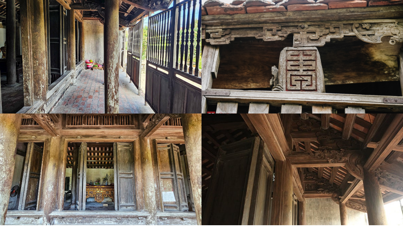 Cấu trúc nhà gồm năm gian, mái ngói đỏ cong vút, gợi hình ảnh những cánh chim đang sải rộng giữa trời. Trên các xà ngang và kèo dọc là những đường chạm khắc rồng phượng, chữ Hán và họa tiết hoa lá mang ý nghĩa may mắn, thịnh vượng. Từng góc nhà được bố trí cân đối, tạo cảm giác hài hòa và trang nghiêm. Dù đã qua nhiều thế hệ, những đường nét ấy vẫn giữ được vẻ tinh tế, như kể lại câu chuyện về tay nghề của người xưa.