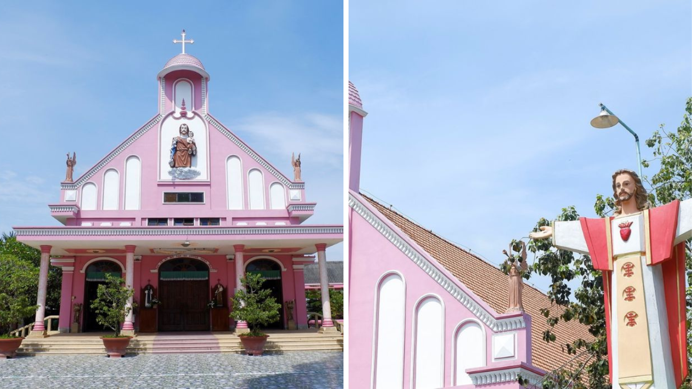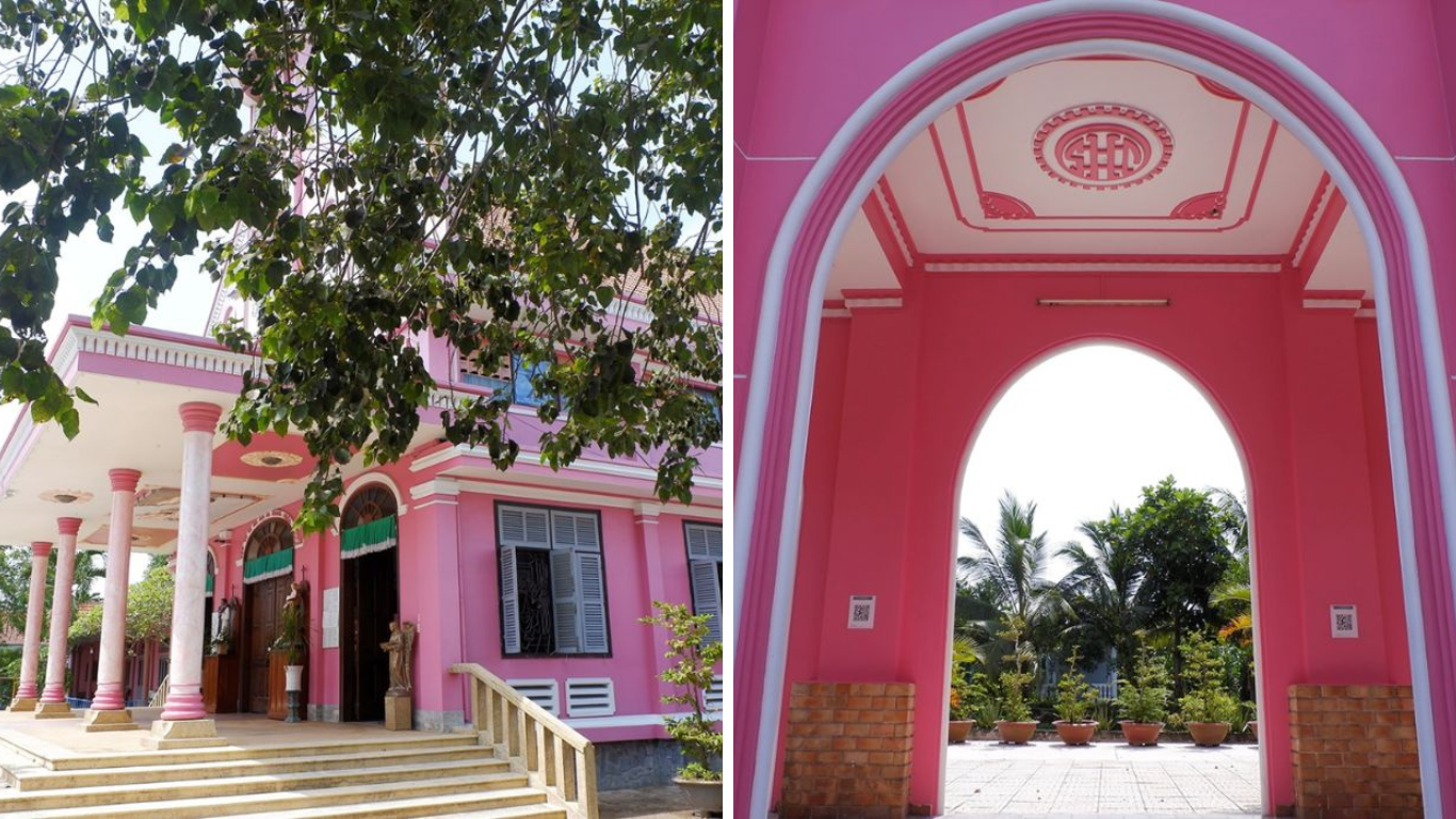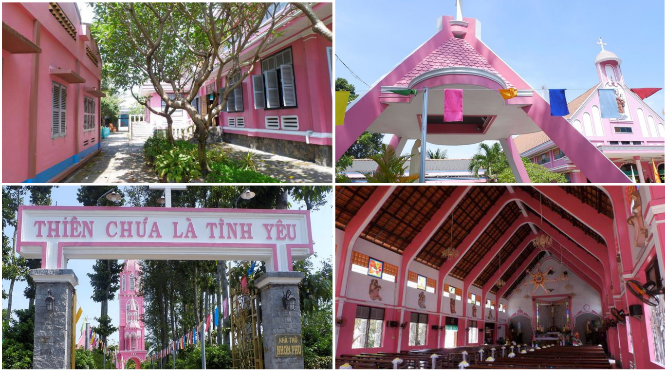 Điểm đặc trưng khiến Nhà Thờ Nhơn Phú trở nên nổi bật chính là gam màu hồng dịu dàng phủ khắp toàn bộ công trình. Màu sắc ấy hòa vào ánh nắng miền Tây, tạo nên khung cảnh vừa trang nghiêm vừa lãng mạn. Kiến trúc nhà thờ mang phong cách châu Âu cổ điển, với mái vòm cao, hàng cửa sổ cong đều nhau và tháp chuông thanh thoát vươn lên trời xanh. Từng chi tiết trang trí đều được chạm khắc tinh tế, thể hiện bàn tay khéo léo của những người thợ xưa.